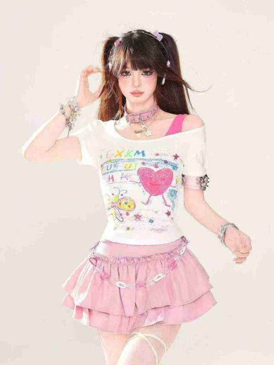 [月亮]:夏季新款涂鸦印花露肩设计纯棉辣妹上衣