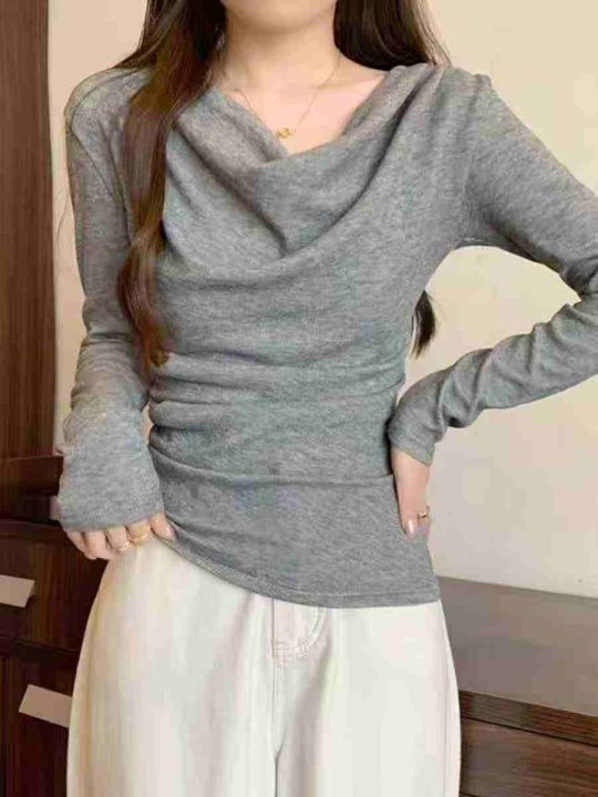 全清价5.8法式荡领辣妹长袖修身显瘦薄绒内搭打底衫上...
