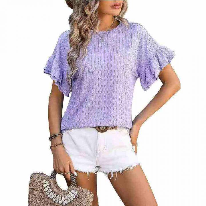 春夏新款纯色圆领荷叶袖短袖T恤上衣,数量26件,码数M-2XL,独立包装,5.8元