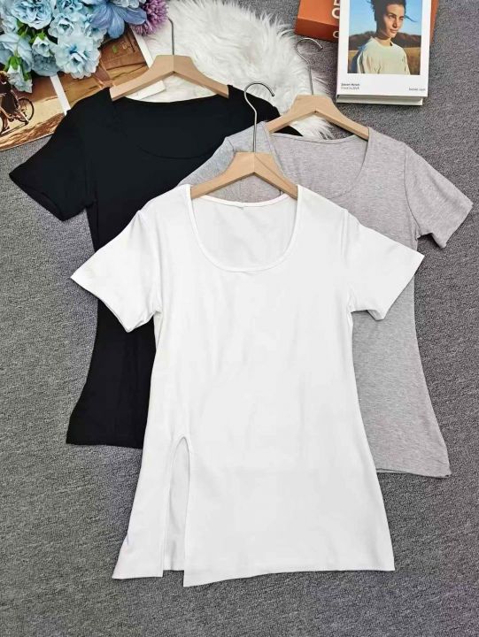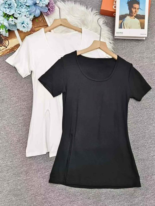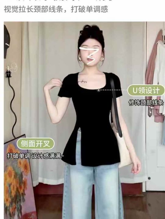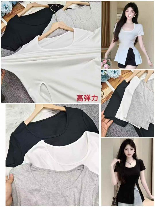 法式纯欲风设计感开叉短袖t恤棉上衣,独立包装,整款三色,面料柔软弹力好,码数M-3XL,数量114件