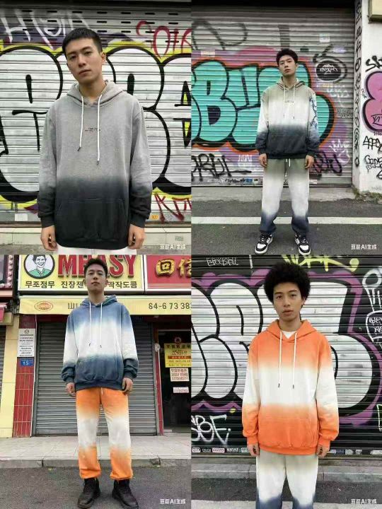 渐变/扎染/连帽卫衣,纯棉毛圈面料,落肩大版宽松卫衣,数量2560件左右,单款多个颜色,码数M-L-XL-XXL-XXXL,独立包装吊牌,分货➕1元/件。Gradient/Tie-dye/Hooded Sweatshirts, Men\'s Sweatshirts, Approximately 2560 pieces available, Sizes M-L-XL-XXL-XXXL, Price: RMB 9.9 per piece.