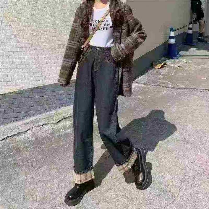 秋冬复古加绒加厚宽松显瘦牛仔裤女大码胖mm高腰直筒翻边阔腿长裤180件,独立包装带吊牌,尺码S~5XL全清福利价9.5