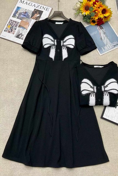 夏季新款法式赫本风黑色蝴蝶结设计感闺蜜姐妹装减龄小...