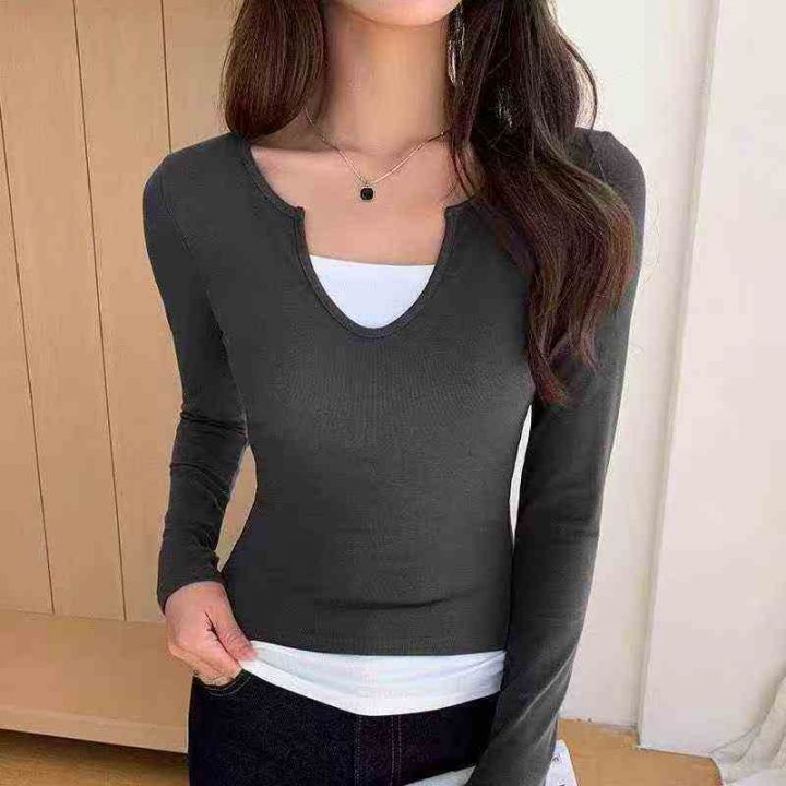 ️6180件\'美式甜辣妹韩版假两件长袖t恤女春夏修身打底衫撞色纯欲显瘦上衣,独立包装,码数M-2XL,全清5.8元\'分货➕0.5