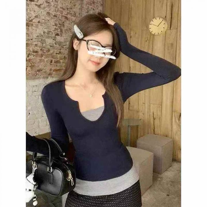 ️6180件\'美式甜辣妹韩版假两件长袖t恤女春夏修身打底衫撞色纯欲显瘦上衣,独立包装,码数M-2XL,全清5.8元\'分货➕0.5