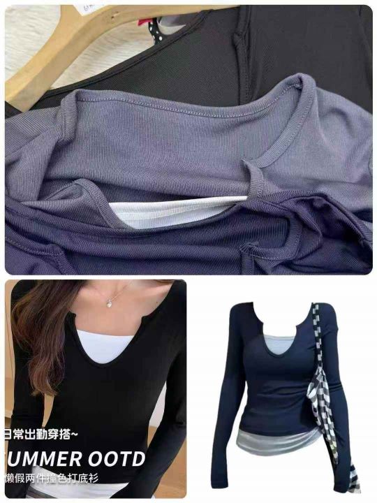 ️6180件\'美式甜辣妹韩版假两件长袖t恤女春夏修身打底衫撞色纯欲显瘦上衣,独立包装,码数M-2XL,全清5.8元\'分货➕0.5