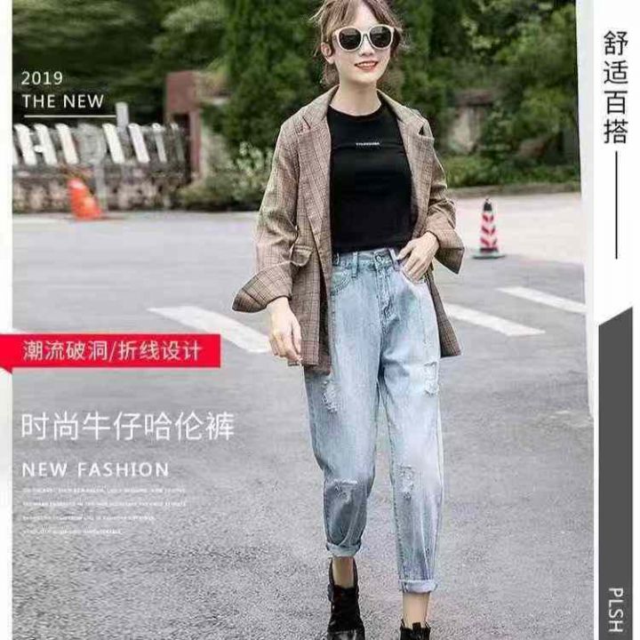 夏季破洞牛仔裤女宽松显瘦哈伦九分裤松紧腰大码老爹裤,数量330件,码数M-2XL,独立包装,全清11.8元