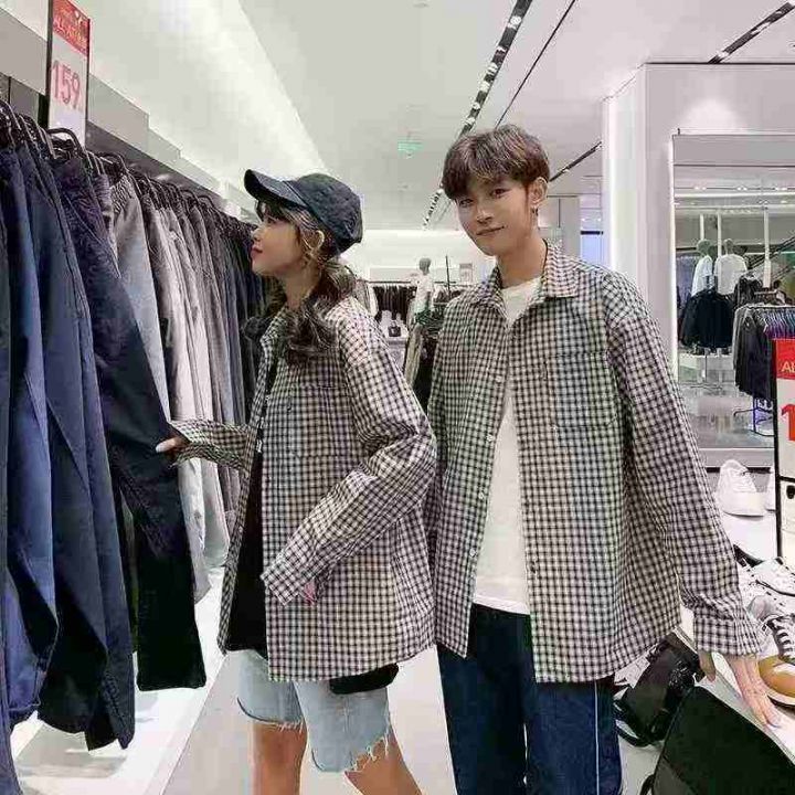 新款长袖衬衫男女时尚潮流百搭撞色格子衬衫上衣服男外...