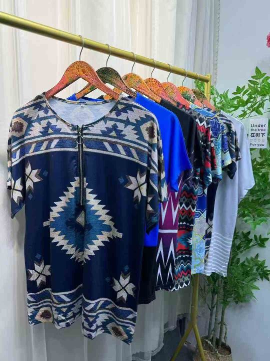 1500件,夏季欧美热销wish 独立站女民族风印花棉短袖v领拉链T恤上衣,独立包装,S-5XL,分货➕1,货号001#30