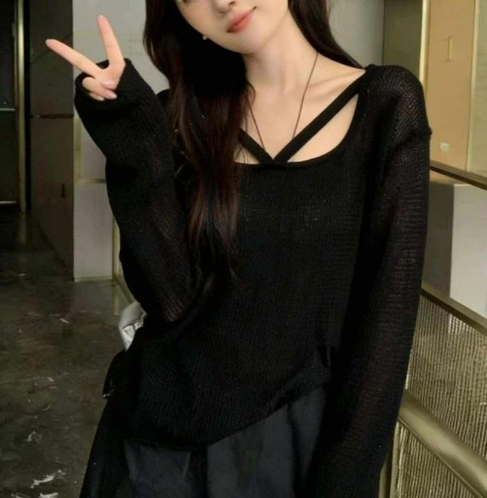 春夏季新款网红镂空设计款宽松百搭长袖针织衫,独立包...
