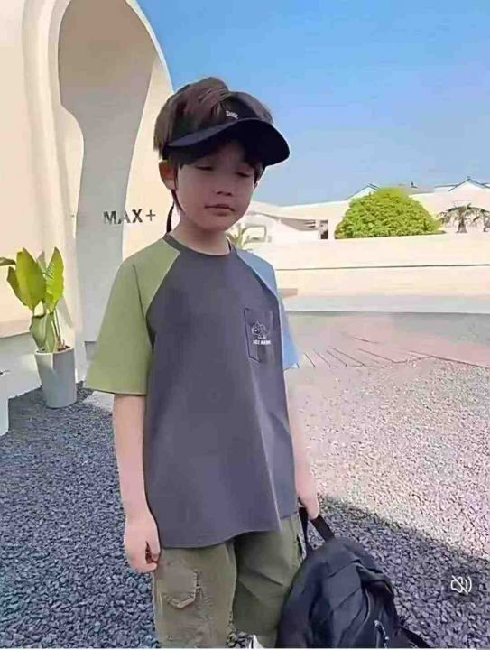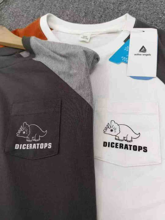 高品质插肩拼色童装T恤短袖 数量1200件左右 尺码110--160 整款两个色 胸前口袋 后面印花 后领包边 独立包装带吊牌 货品整洁质佳