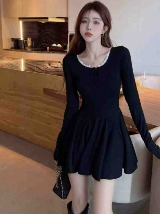碎花裙女夏季新款女长款修身显瘦方领短袖小黑裙子法式收腰连衣裙260件,独...