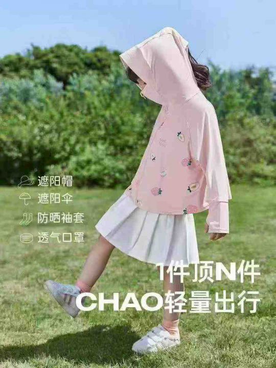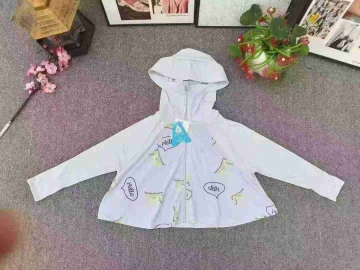 统一品牌童装印花防晒衣,数量1800件左右,尺码110--160,两个色,后领包边,锦纶氨纶面料,独立包装带吊牌,大货干净整洁质佳!模特图供参考