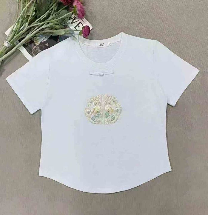 1625件国风重工刺绣中式盘扣拉架棉短袖T恤女,以黑色...