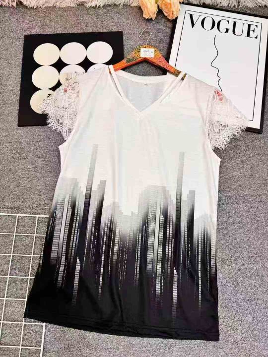 721件,夏季新款欧美女装V领蕾丝渐变个性印花宽松短袖T恤女,独立包装\'码数S-5XL,分货➕1,货号001#30