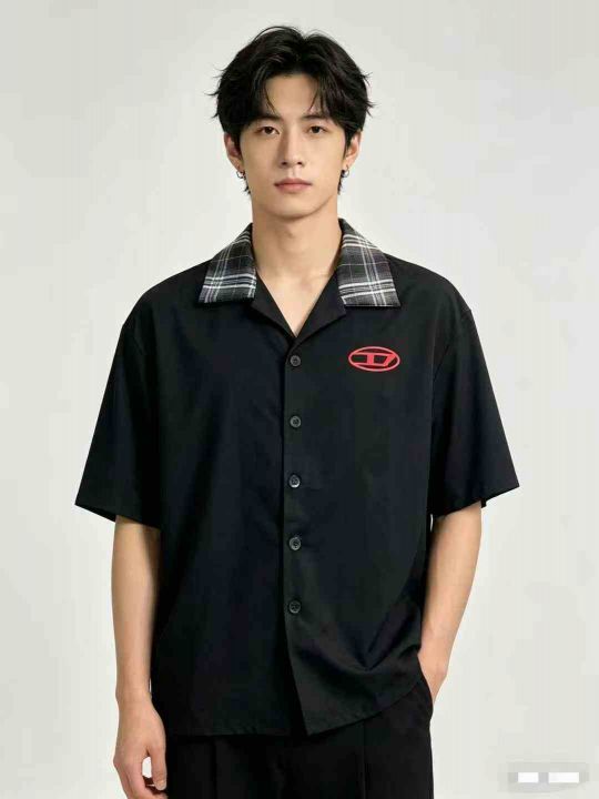 240件左右轻熟风美式复古格领撞色男士短袖衬衫,做工...