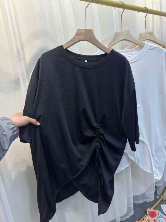 网红开衩不规则中长款中袖抽绳防晒衣t恤女夏洋气时髦...
