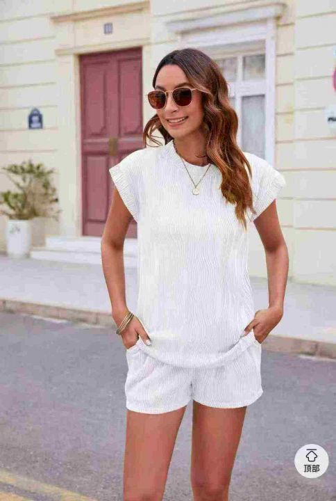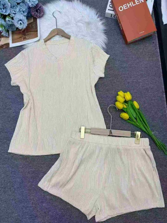 V领女夏季肌理感 短袖短裤两件套装 宽松百搭潮 独立包装,码数S-XL码,数量126套(货号406#12)