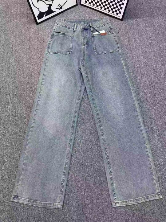 新款时尚百搭双口袋带皮标直筒牛仔阔腿裤,单款两色,...