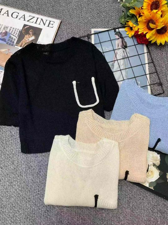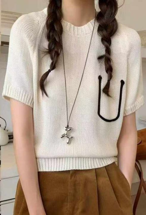 夏季新款韩系亚麻透气肌理薄款圆领口袋设计款冰丝针织...