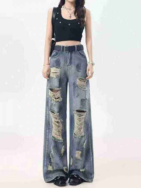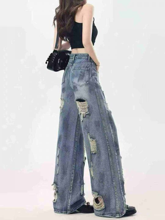 复古扎染废土风破洞女牛仔裤水洗垂感阔腿拖地裤,码数...