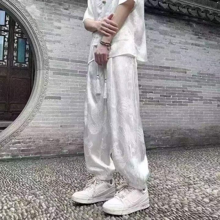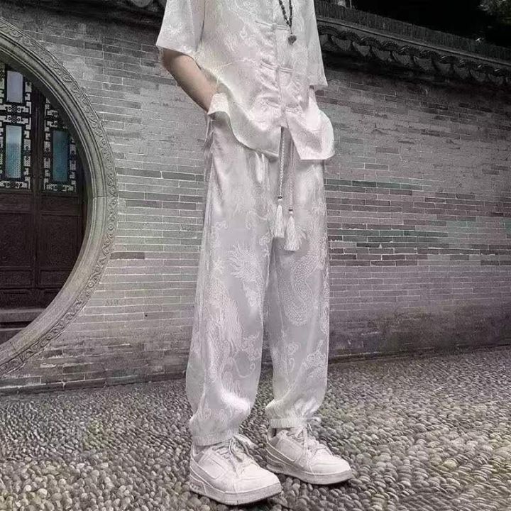 中国风龙纹提花冰丝长裤男款 208条,全清7.8元,正品独立包装,黑白两个色,码数~M到3XL, 2026年新款中式国风冰丝裤子男生垂感提花缎面休闲裤高级感白色直筒长裤