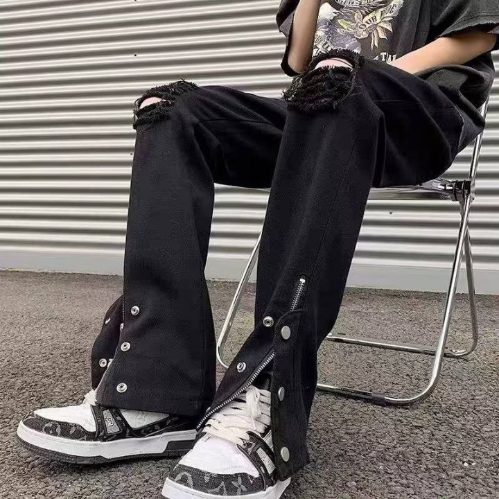 ☕️夏季黑色破洞牛仔裤男欧美高街拉链直筒裤潮牌阔腿...