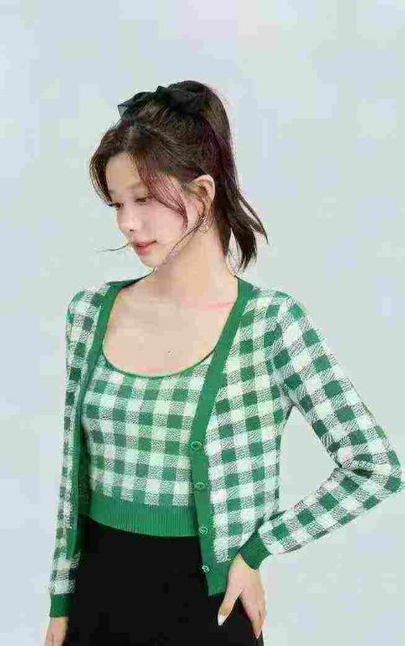 全清8.8元/套139套小香风棋盘格针织毛衣开衫+针织吊带背心2件套,独立包装...