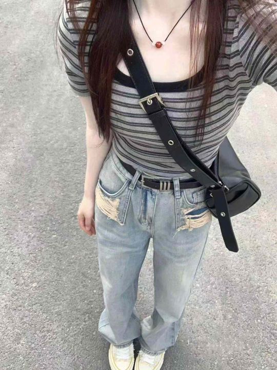 [月亮]:复古撞色U领正肩条纹T恤