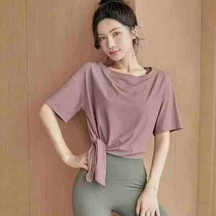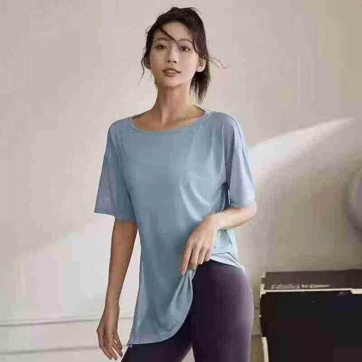 天猫在售款300件左右夏季薄款运动宽松下摆开叉不规则瑜伽服短袖T恤,高弹力,单款三色,S-XL,独立包装带吊牌