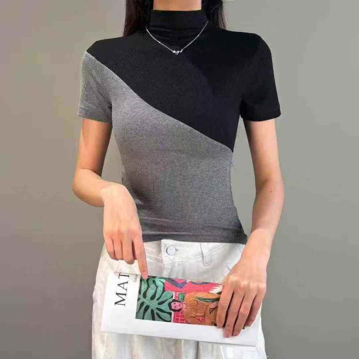 天猫在售款188件左右高品质夏季半高领拼色螺纹短袖T恤,单款单色,高弹力,码数S-XL,独立包装带吊牌