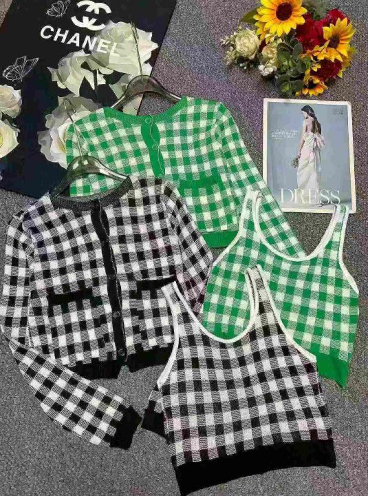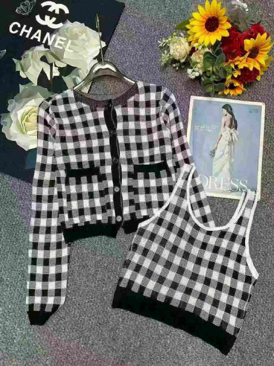 139套小香风棋盘格针织毛衣开衫+针织吊带背心2件套,独立包装,均码