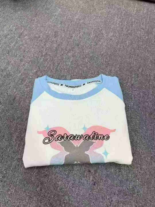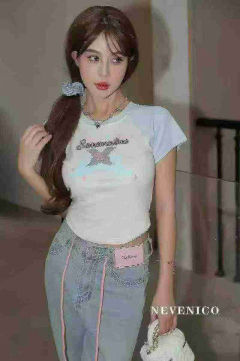 清5.8分货➕1甜酷蝴蝶拼色插肩短袖t恤女,带弹力,数...