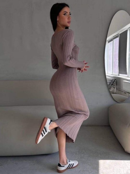 捡漏款,春夏季新款欧美纯色圆领坑条弹力修身显瘦长款针织毛衣连衣裙,长袖...