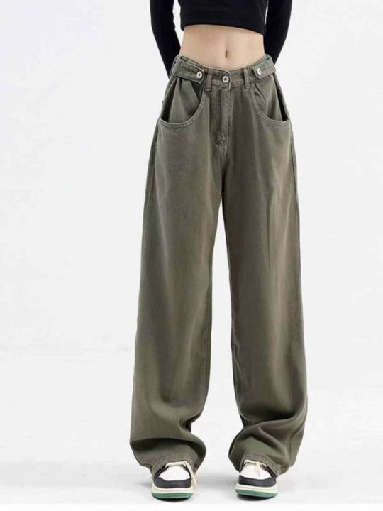 春季新款网红美式复古垂坠感直筒宽松日系工装军绿色直...