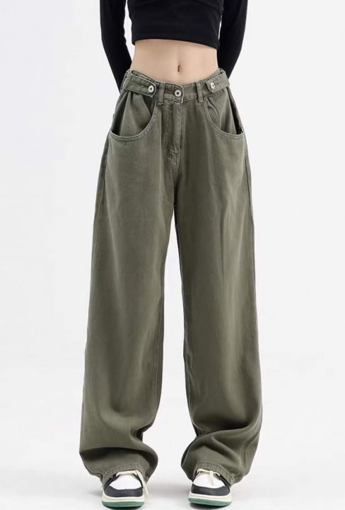 春季新款网红美式复古垂坠感直筒宽松日系工装军绿色直...