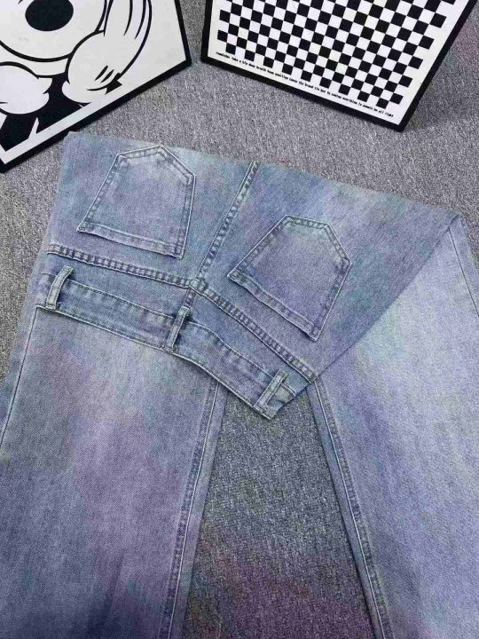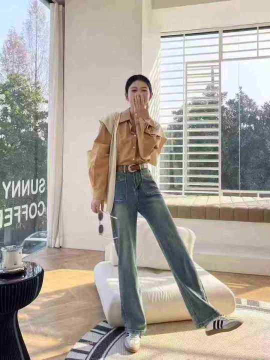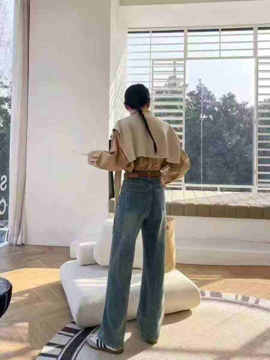 新款时尚百搭双口袋带皮标直筒牛仔阔腿裤,单款两色,...
