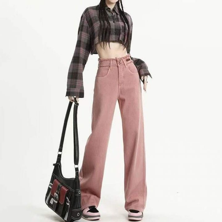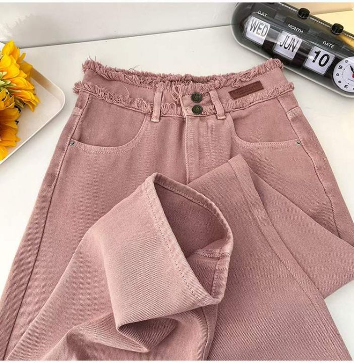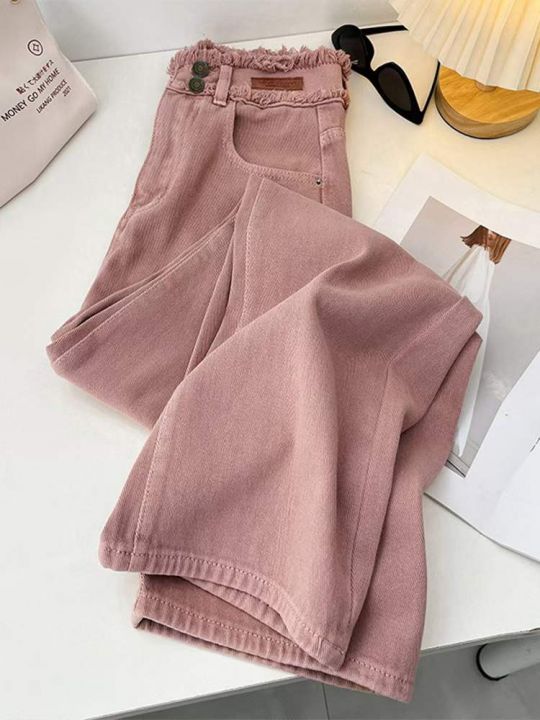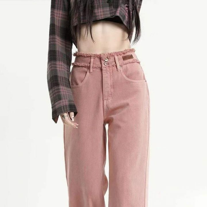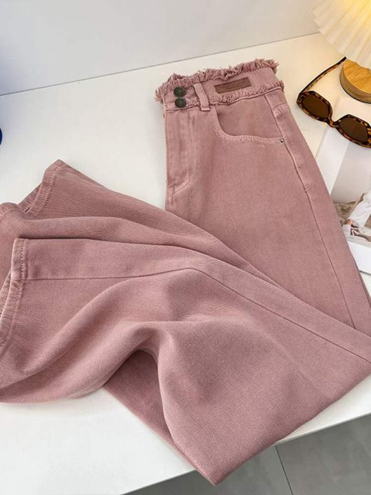 春季新款网红复古脏粉色双扣高腰毛边设计感窄版直筒阔...