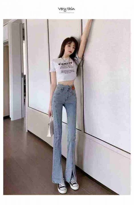 ☕️弹力开叉牛仔裤女高腰紧身显瘦拖地微喇叭裤226条...
