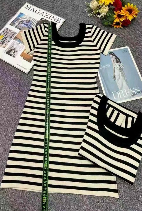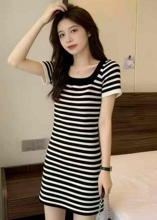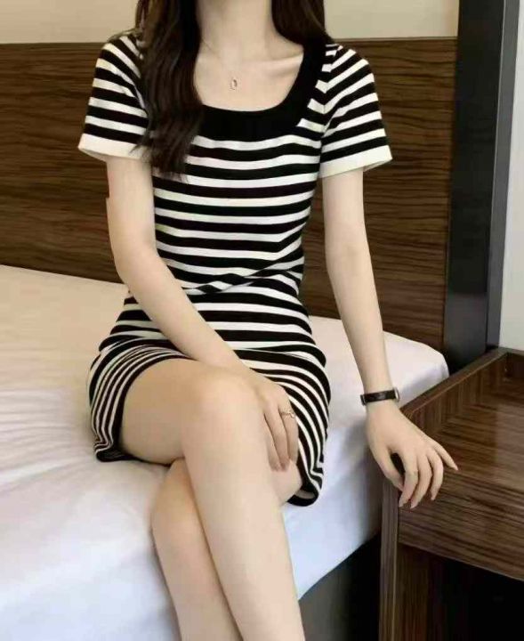 夏季新款撞色法式复古条纹方领短袖t恤针织连衣裙,独...