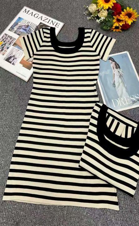 夏季新款撞色法式复古条纹方领短袖t恤针织连衣裙,独...