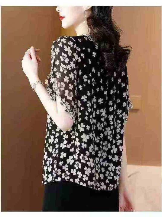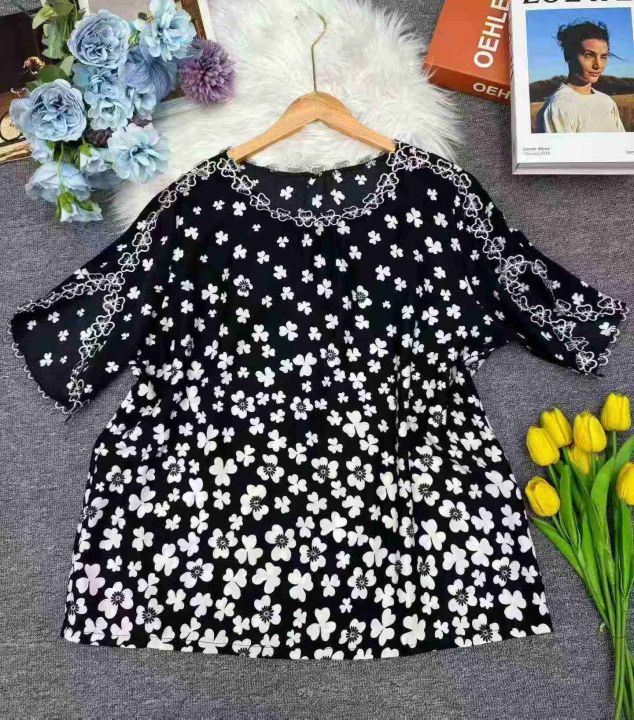 2026夏季新款时尚印花刺绣花边领短袖上衣宽松版 数量:234条 码数:3XL-6xL码 独立包装(货号401#5)