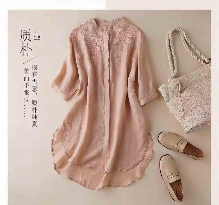 全清3.8,夏季新款五分袖刺绣棉麻衬衣女夏长款外搭圆领衬衫,码数S-2XL,数量40件,独立包装