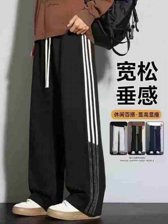 鱼鳞条纹卫裤男春秋款宽松直筒裤子大码三条杠阔腿运动...