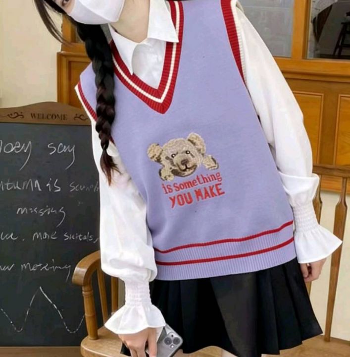 春季新款韩版学院风卡通小熊提花V领套头毛衣马甲,独立包装,均码面料柔软...