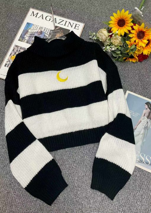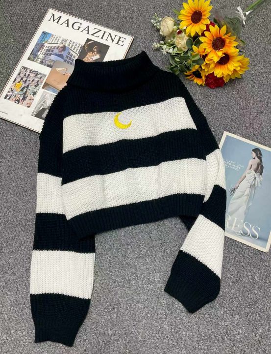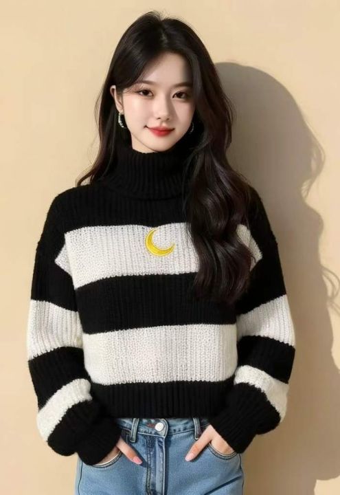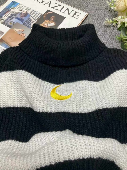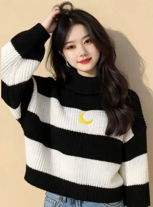 秋冬季新款网红复古刺绣小标撞色条纹宽松套头毛衣,独...