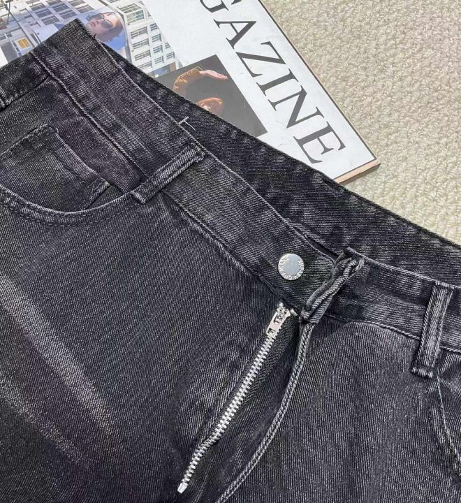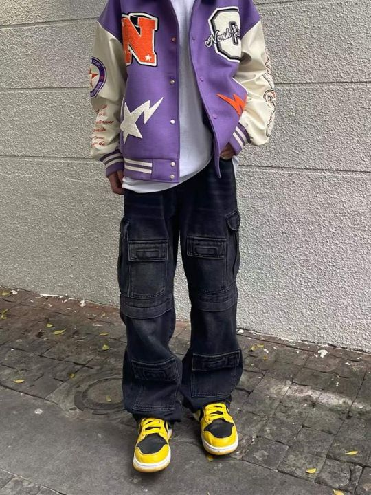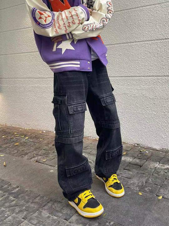春季男士美式复古高街多口袋工装宽松直筒阔腿水洗牛仔...
