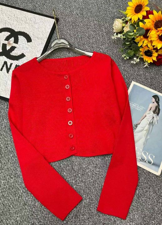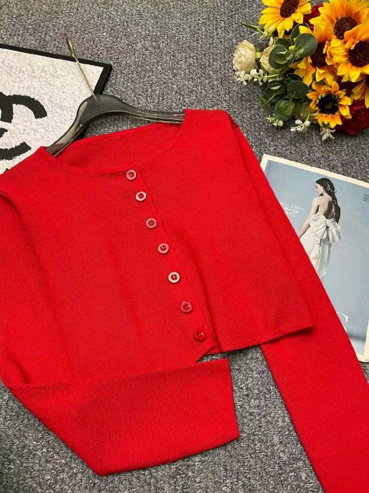 春季新款网红复古红色净版简约长袖针织开衫,独立包装...