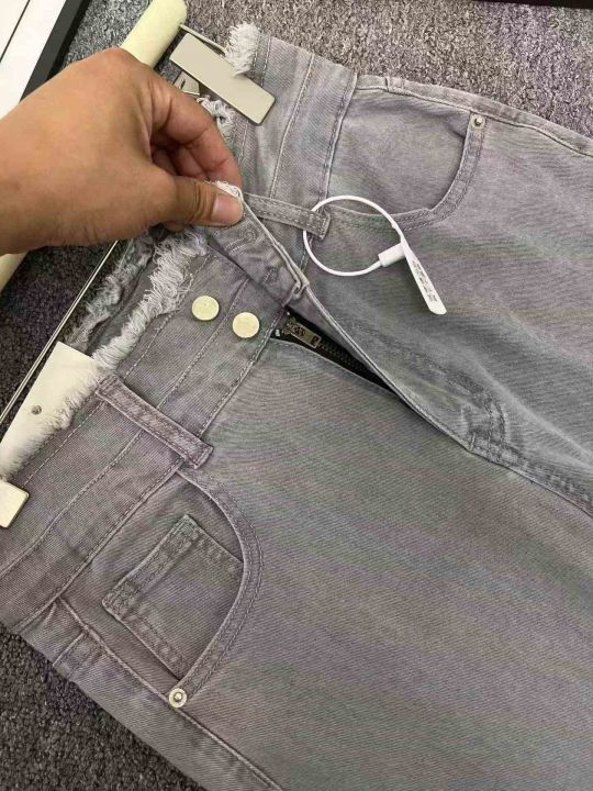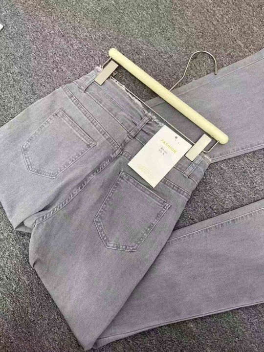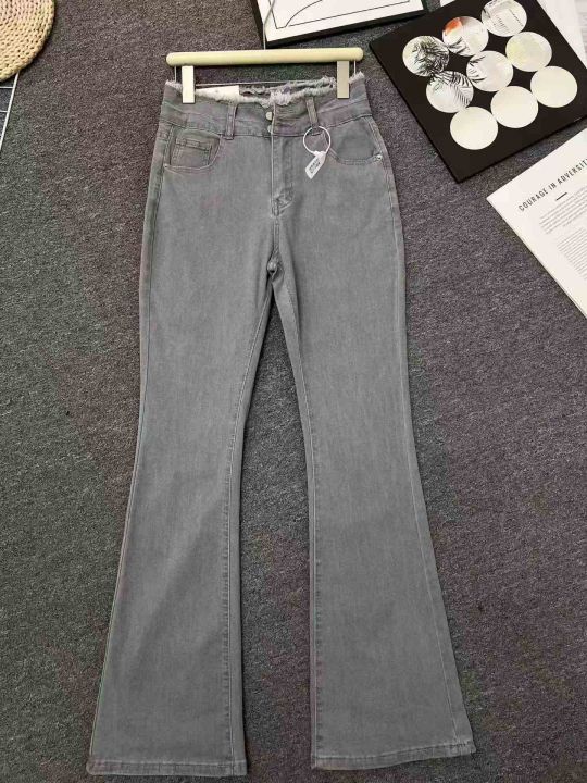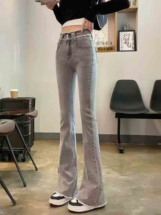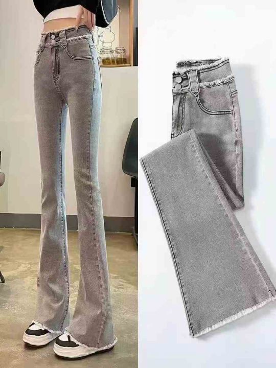 ☕️弹力烟灰色高腰微喇叭牛仔裤新款紧身毛边喇叭显瘦...