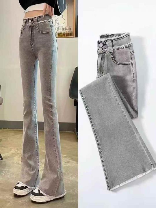 ☕️弹力烟灰色高腰微喇叭牛仔裤新款紧身毛边喇叭显瘦长裤91条全清11.8元,...